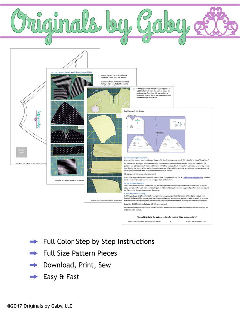 Retro fashion is fun. This hooded poncho in the 1960s style is perfect for today’s girl. The Poncho slips over the head with yarn poms poms for ties. So sixties! If you prefer a current take on a poncho, use ribbon or a clasp in the front. View 2 has a Cowl Neck with an easy one-piece hat. For both views the front and back can be cut on the fold, or on the bias to create a “V” in the front. Fringe can be cut when using a non-fraying knit, or you can turn it under and hem it. Add a trim or a lace for a different look. It’s an easy over the head style even the younger kids can do and loose fitting so it will fit most 14-14.5” dolls.